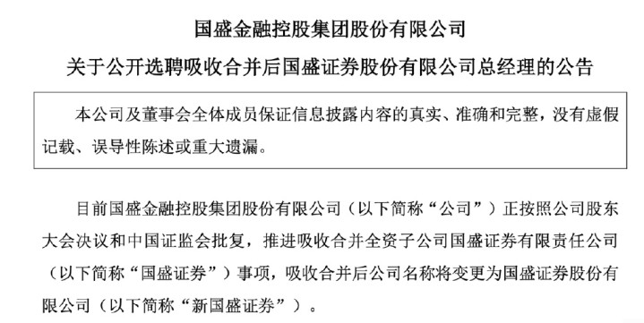 根据公告,为加强新国盛证券经营管理层建设,根据有关部署要求,公司将公开选聘吸收合并后新国盛证券总经理。拟聘人选确定后,公司将结合吸收合并工作进展,根据相关规定履行相应公司治理聘任决策程序和信息披露义务。