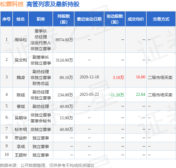松霖科技的高管列表及最新持股情况如下: